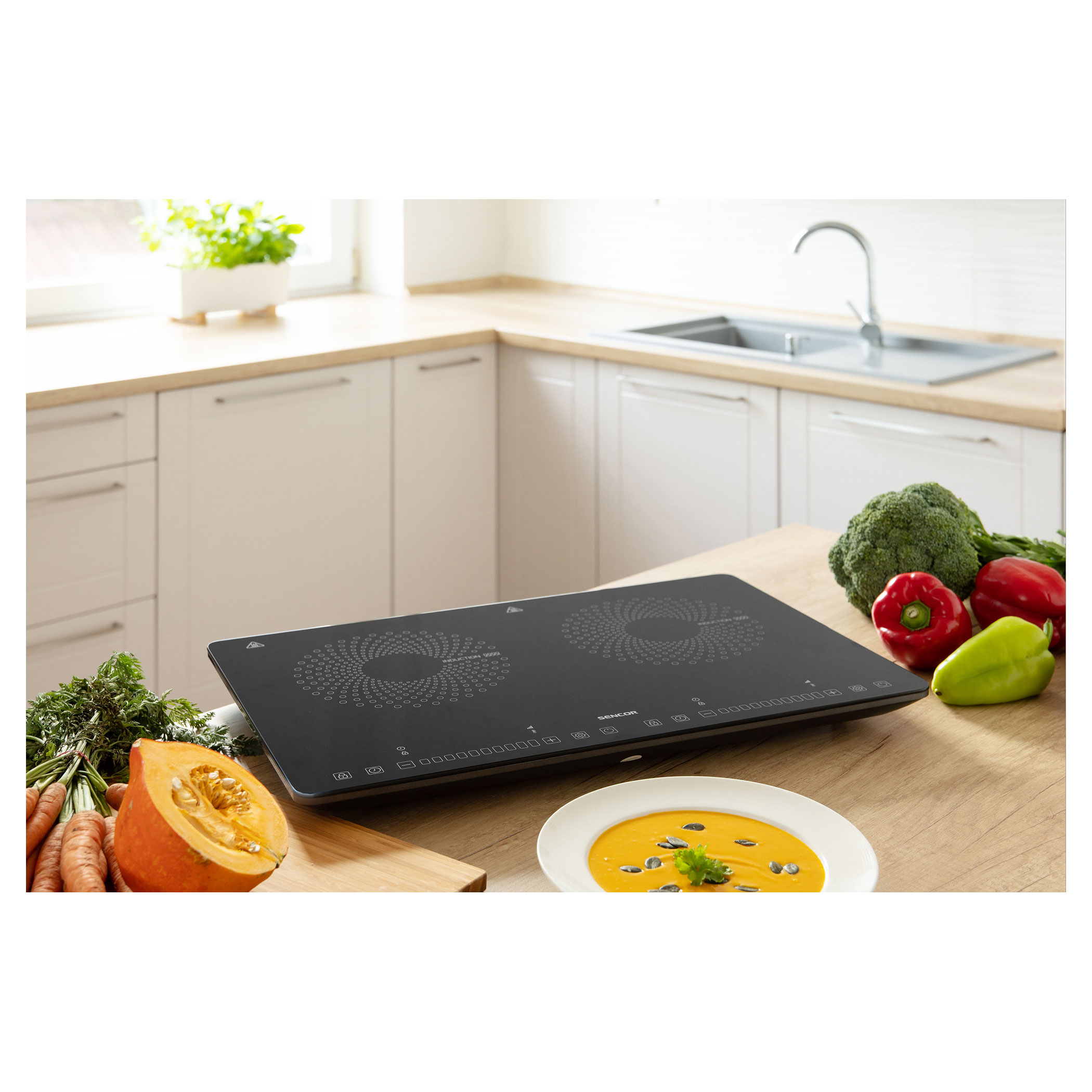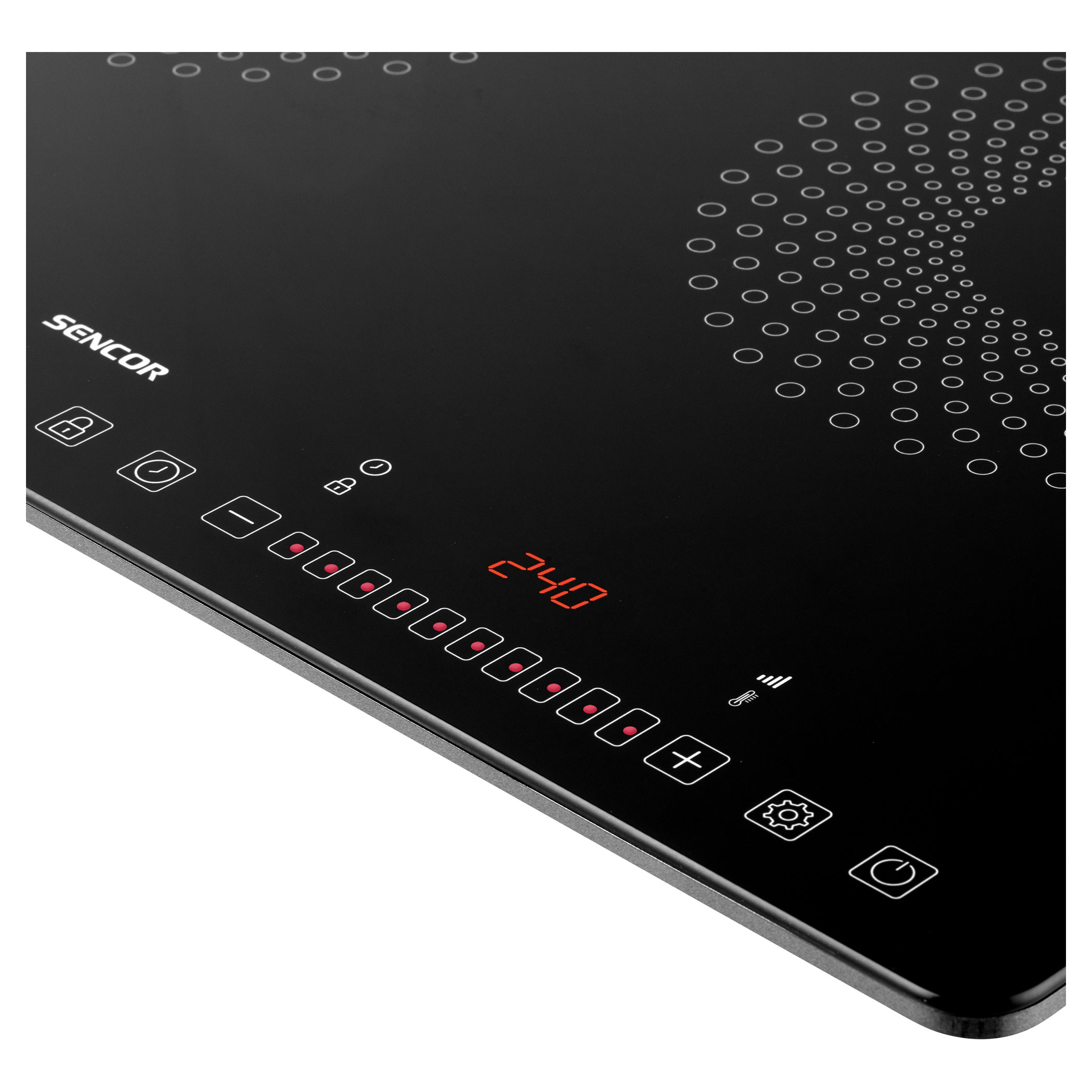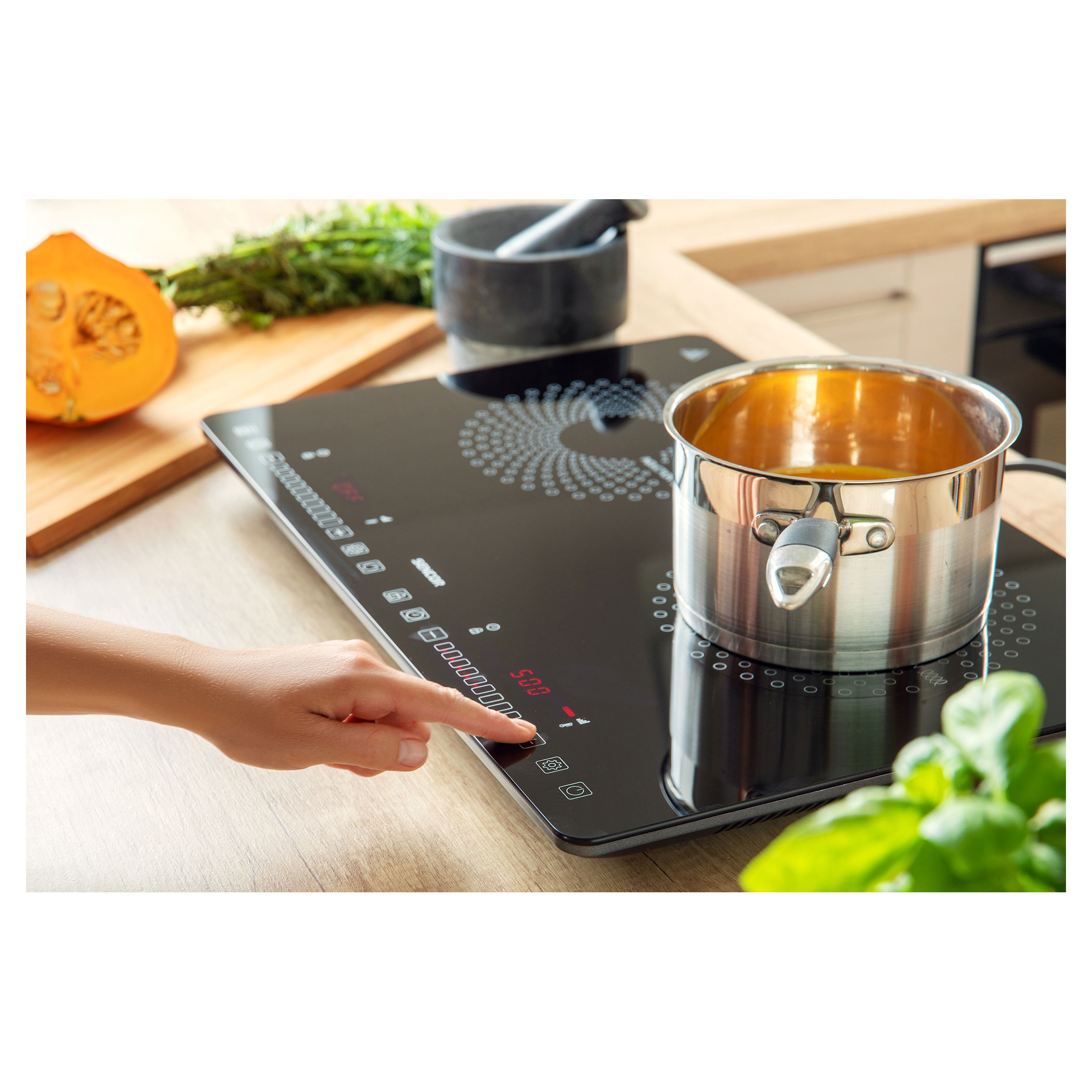 يتم التحكم في الموقد والوظائف الفردية باستخدام أزرار لمسية. يتم ضبط درجة الحرارة والطاقة ببساطة عن طريق تحريك إصبعك إلى اليمين أو اليسار، أي المنزلق. شاشة LCD ذات إضاءة خلفية حمراء كبيرة توفر معلومات حول درجة الحرارة والطاقة.