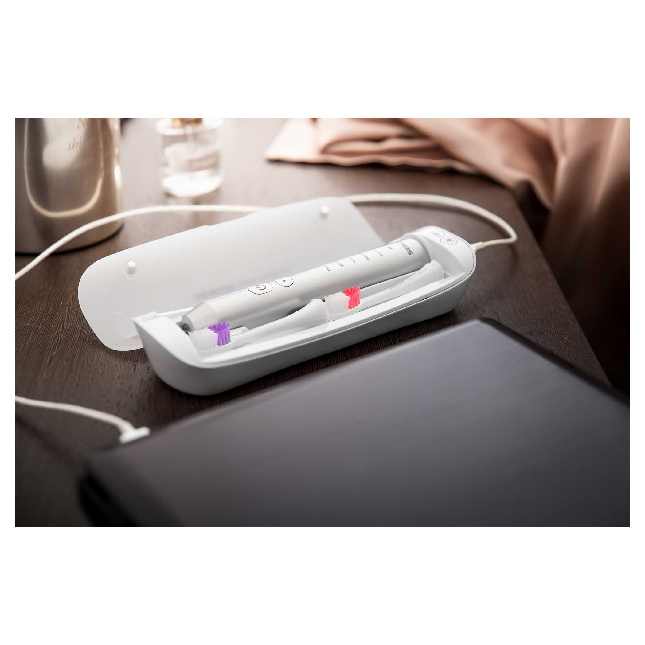 المحتويات المُضمنة: 1 هيكل فرشاة أسنان، 2 رؤوس أساسية، 1 محطة شحن مع حامل في واحد،